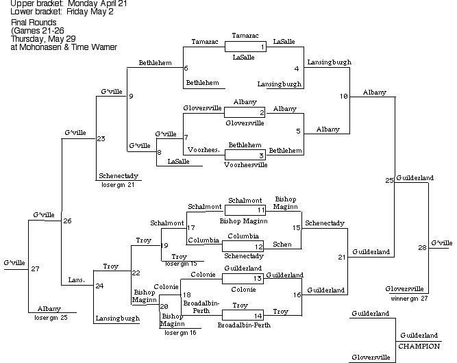 120, Voorheesville 40 Gloversville 180, LaSalle 90 Bethlehem 190, Tamarac 90 Gloversville 160, Bethlehem 85 Albany 155, Lansingburgh 150 (3 O.T.) |