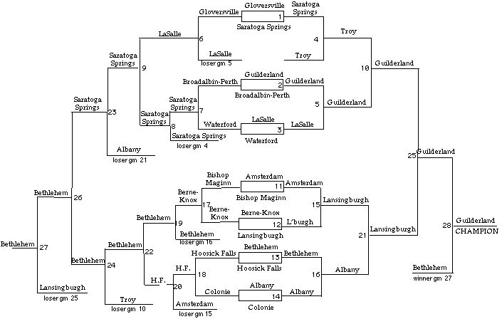 23: Saratoga Springs 250, Albany 135 Game 24: Bethlehem 260, Troy 205 Game 25: Guilderland 310, Lansingburgh 100 Game 26: Bethlehem 185, Saratoga Springs 140 Game 27: Bethlehem 295, Lansingburgh 60 Game 28 (CHAMPIONSHIP): Guilderland 260, Bethlehem 225 (O.T.) |