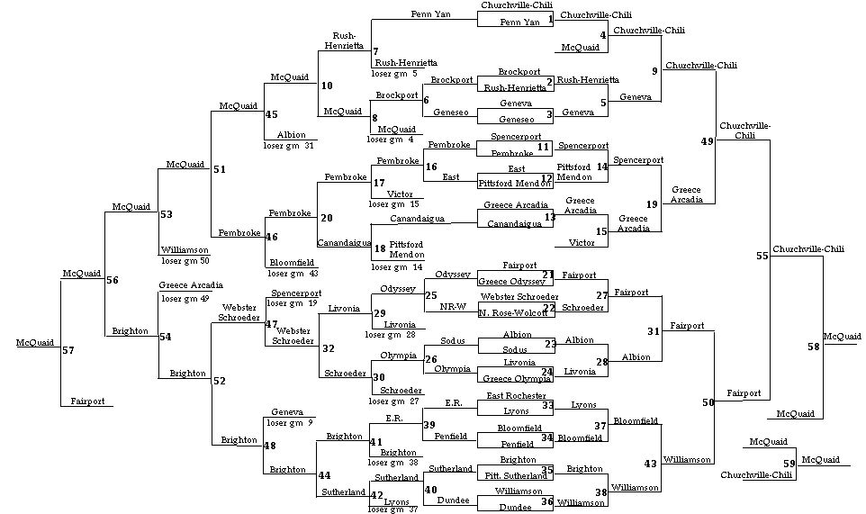 45: McQuaid 335, Albion 140 Game 46: Pembroke 230, Bloomfield 110 Game 47: Webster Schroeder 185, Spencerport 175 Game 48: Brighton 205, Geneva 160 Game 49: Churchville-Chili 165, Greece Arcadia 130 Game 50: Fairport 210, Williamson 75 Game 51: McQuaid 185, Pembroke 150 |