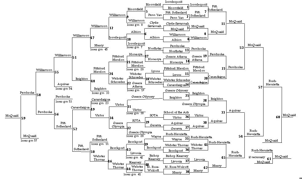 Williamson 120, Mercy 115 Game 48: Brighton 135, Pittsford Mendon 110 Game 49: Canandaigua 195, Victor 90 Game 50: Pittsford Sutherland 150, Webster Thomas 145 Game 51: Williamson 220, Brighton 135 Game 52: Pittsford Sutherland 150, Canandaigua 135 Game 53: McQuaid 225, Pembroke 120 |